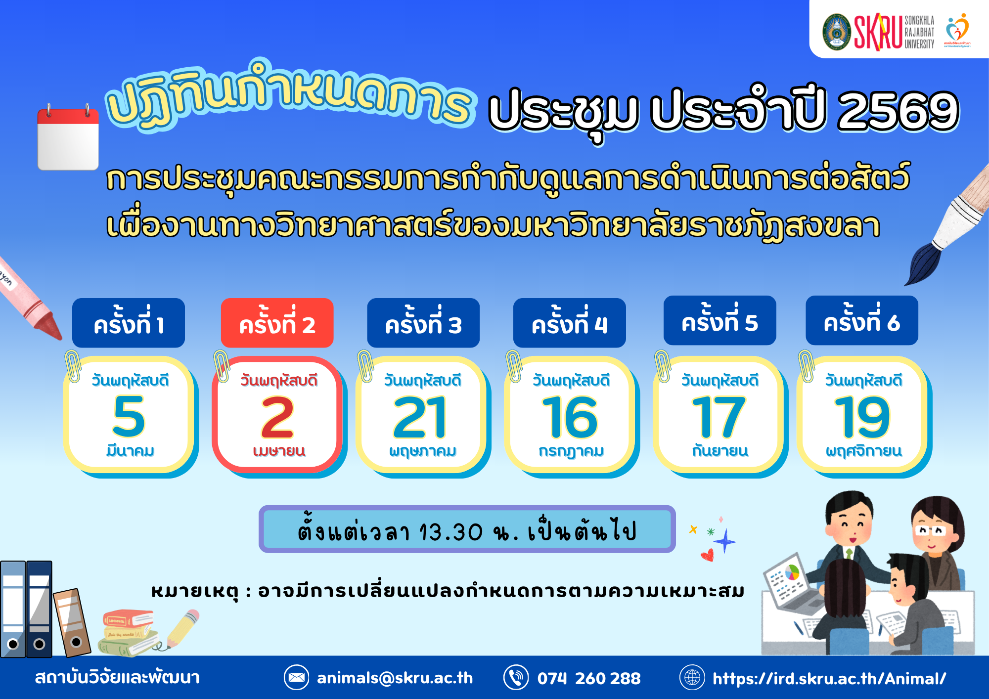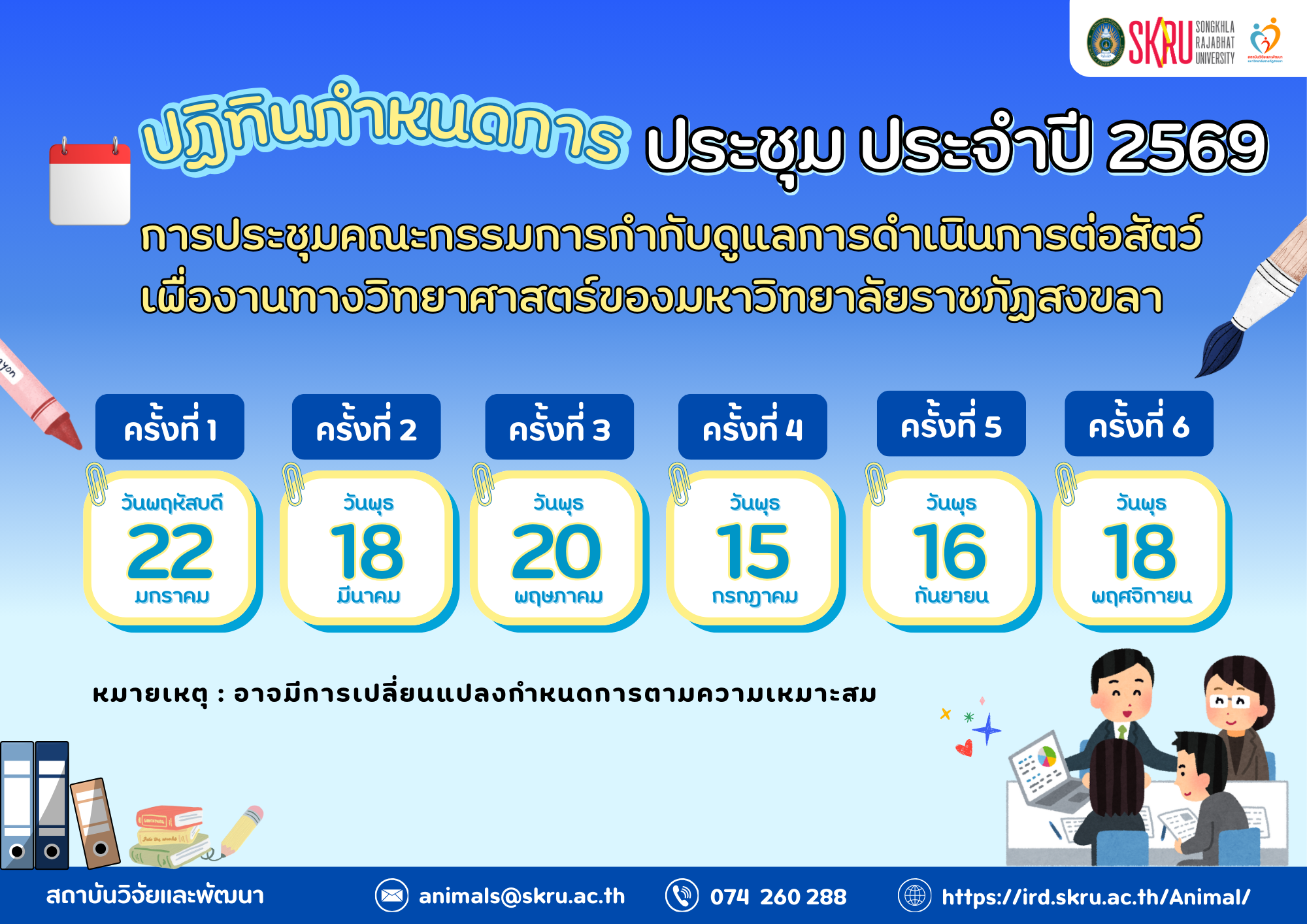 ปฏิทินกำหนดการประชุมคณะกรรมการกำกับดูแลการดำเนินการต่อสัตว์เพื่องานทางวิทยาศาสตร์ของมหาวิทยาลัยราชภัฏสงขลา ประจำปี พ.ศ. 2569